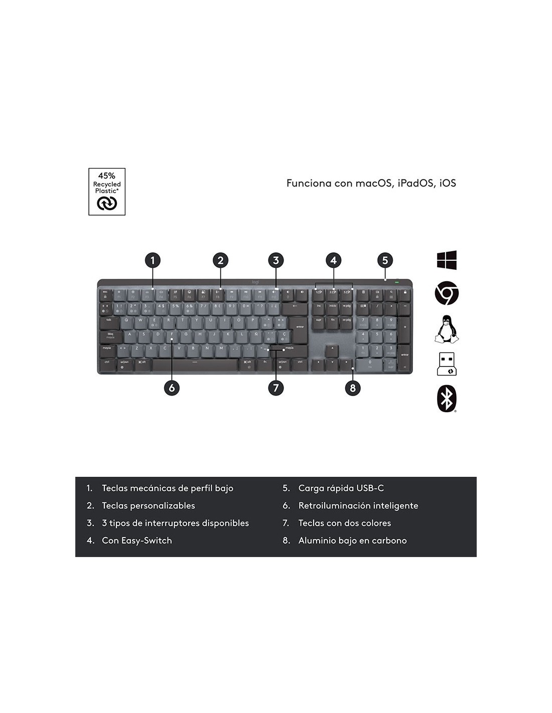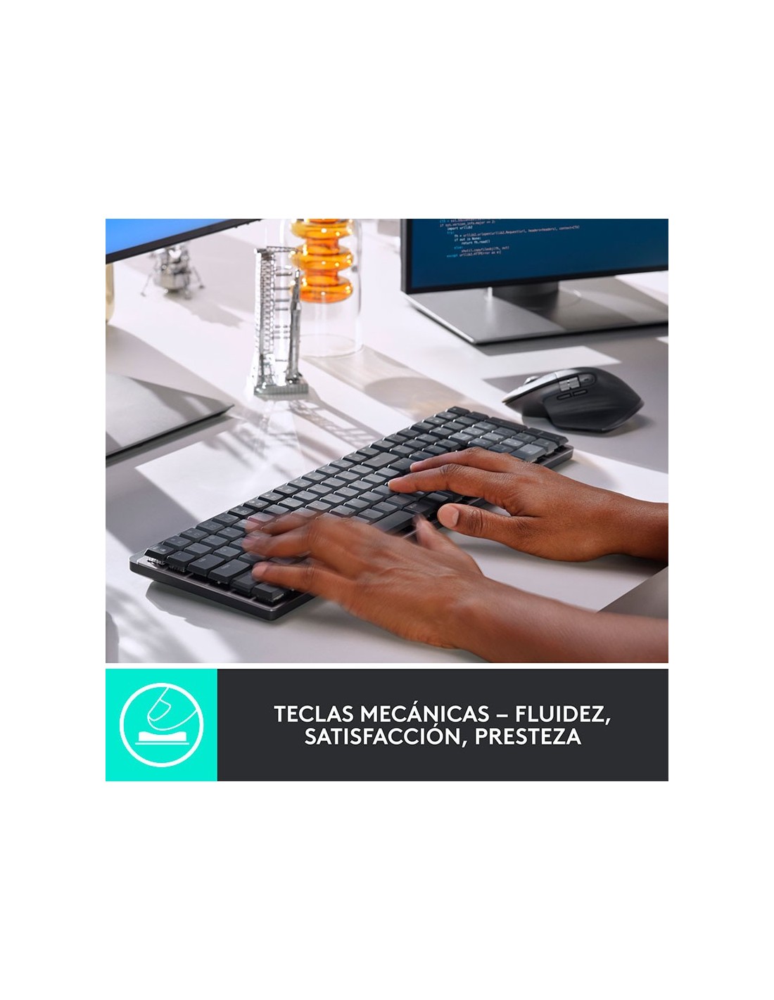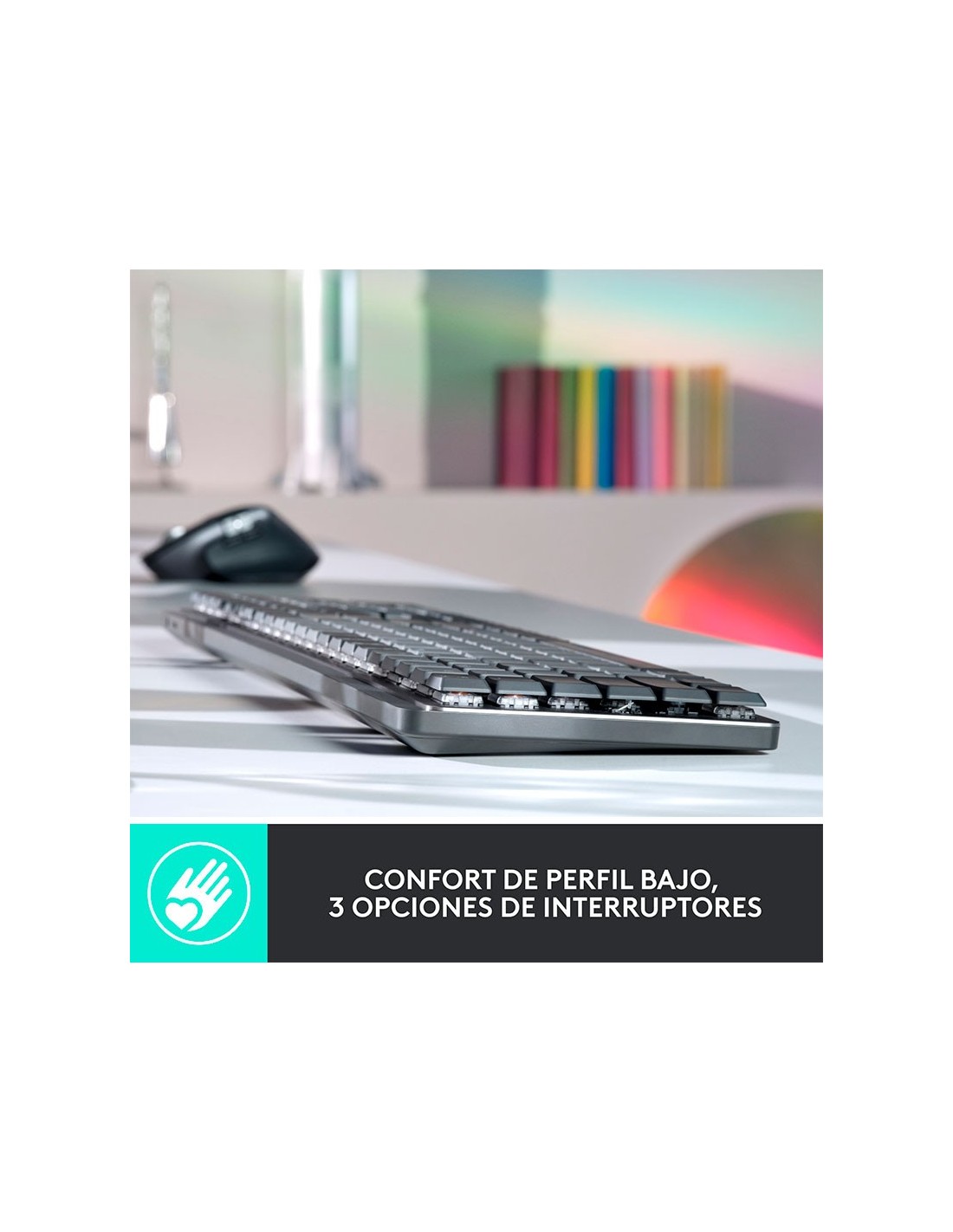 Siente cada momento de tu proceso creativo o cada línea de código con MX Mechanical, irresistiblemente táctil. Con teclas mecánicas de perfil bajo en 3 tipos de interruptores a elegir para una respuesta satisfactoria con cada pulsación, iluminación inteligente e Easy-Switch, lo que te permite conectar hasta 3 dispositivos. Los interruptores mecánicos de perfil bajo ofrecen una sensación de escritura profunda y reconfortante. Los dedos se deslizan sin esfuerzo por la superficie mate de las teclas, que con dos colores guían la visión periférica para facilitar la orientación de los dedos y mantener la fluidez.