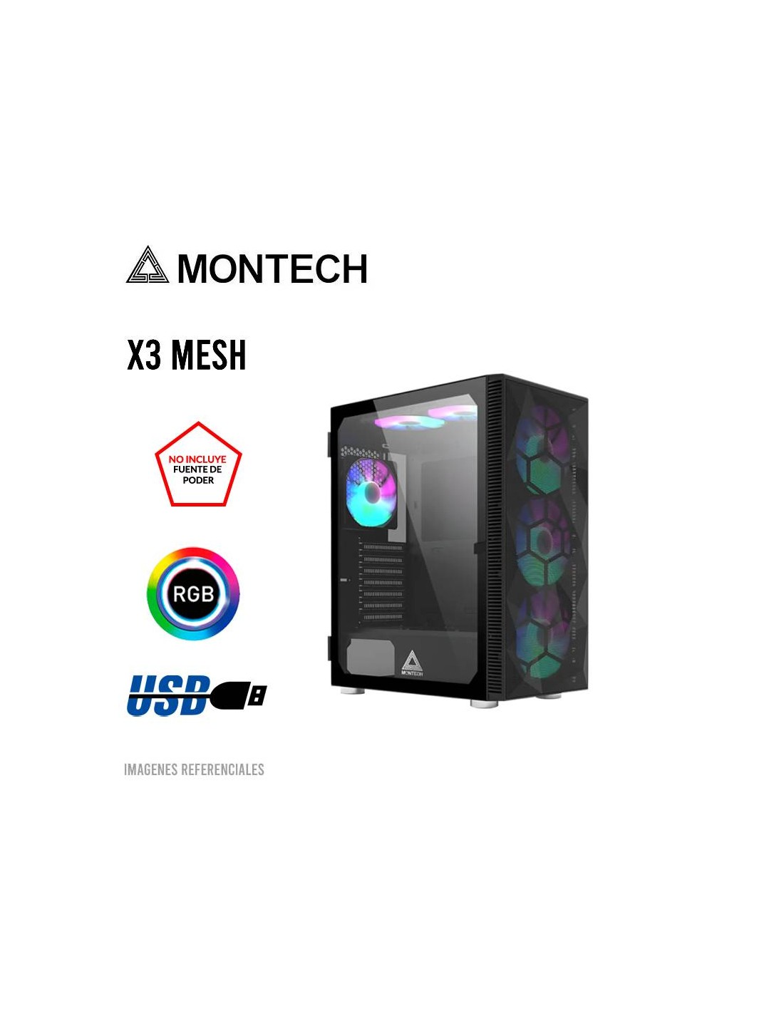 El Montech X3 Mesh en color negro es un case gamer mid-tower con panel frontal de malla metálica para mejor ventilación y lateral de vidrio templado tipo puerta abatible. Incluye seis ventiladores LED RGB fijos preinstalados, brindando excelente flujo de aire y una estética llamativa. Es compatible con placas ATX, Micro-ATX y Mini-ITX, tarjetas gráficas de gran tamaño y opciones de refrigeración líquida. Su diseño espacioso y buena ventilación lo hacen ideal para setups gaming accesibles y eficientes.