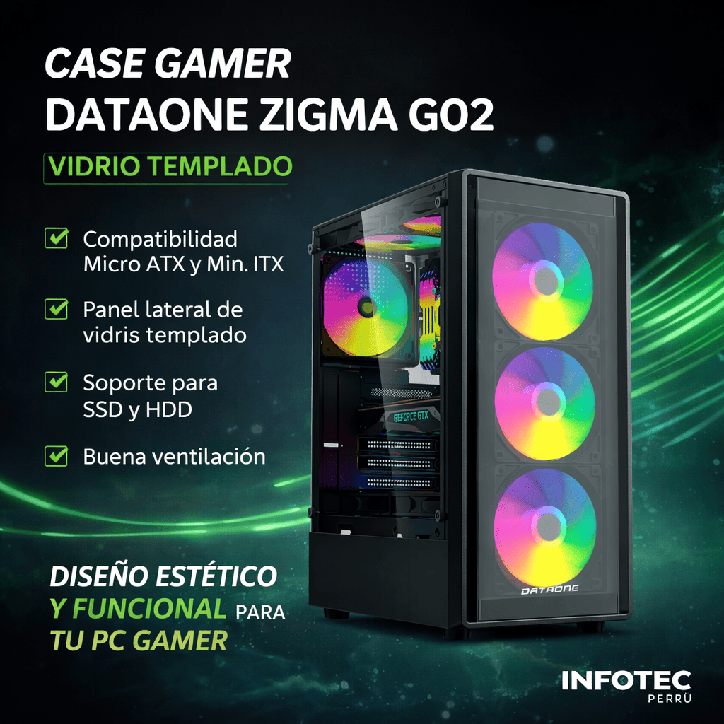 CASE GAMER HALION DATAONE ZIGMA G02 VIDRIO TEMPLADO| S/FUENTE| 4 LED-RGB