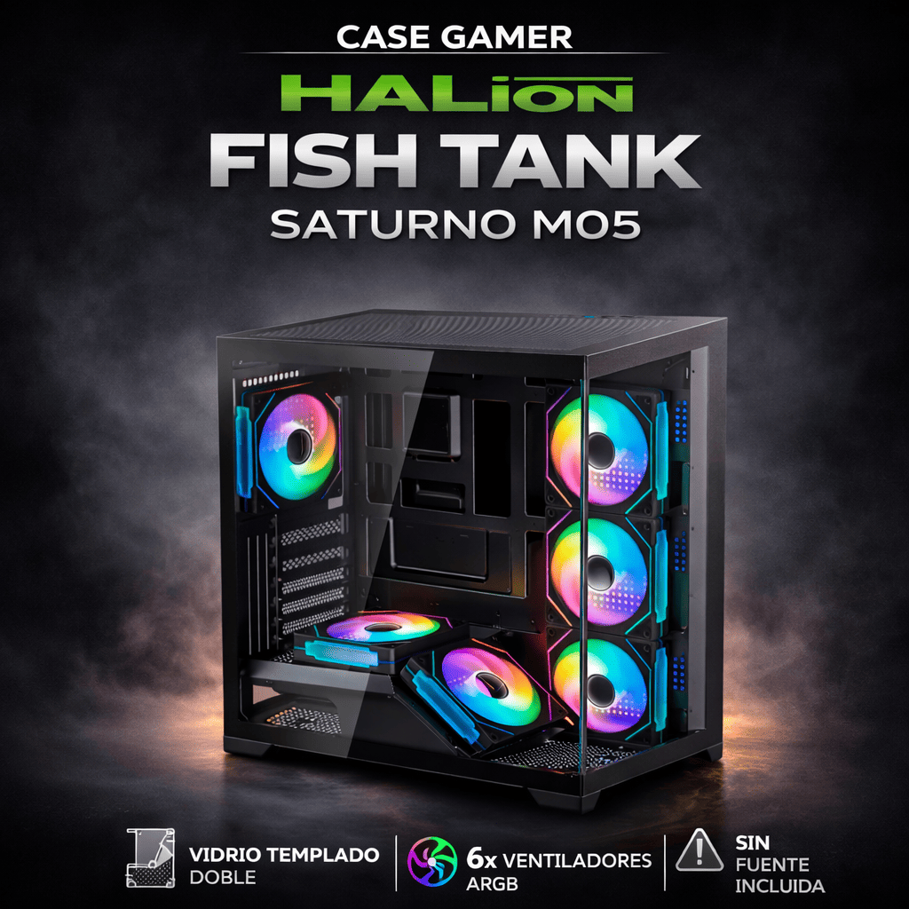 CASE GAMER HALION FISH TANK SATURNO M05 S/FUENTE VIDRIO TEMPLADO 6XLED-ARGB