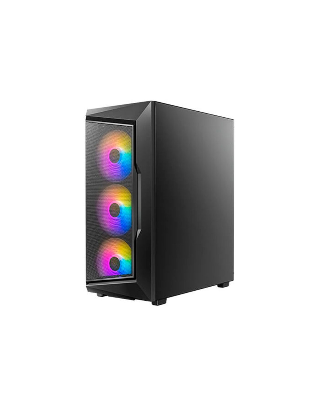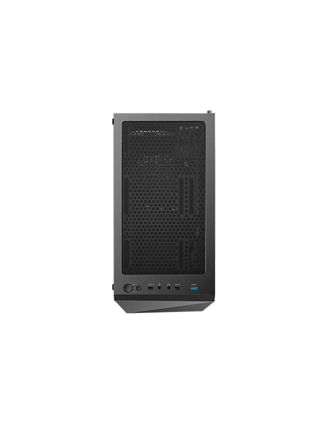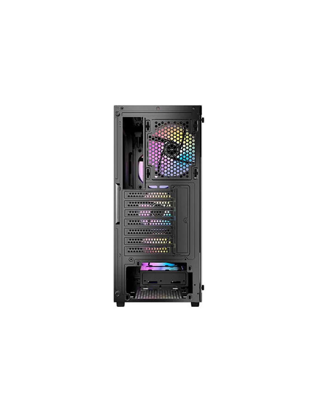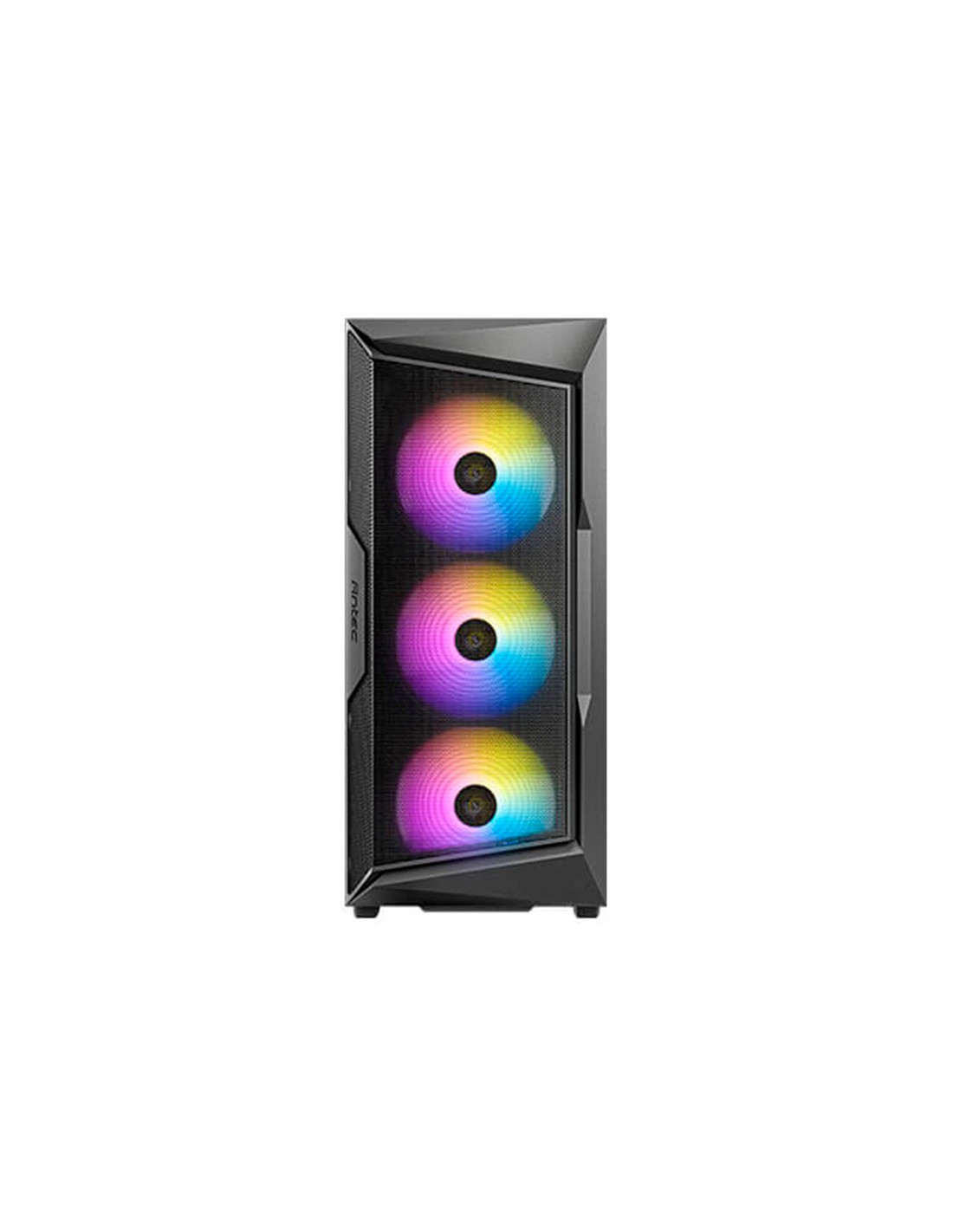 El panel frontal presenta un diseño de malla amplio con un estilo geométrico que optimiza el flujo de aire y previene el polvo. La iluminación ARGB crea diversos efectos visuales.