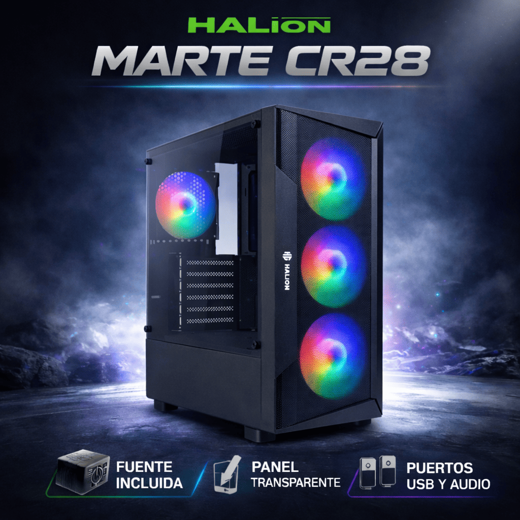 CASE GAMER HALION MARTE CR28 PANEL VIDRIO TEMPLADO | MALLA | 500W | 4 FAN LED
