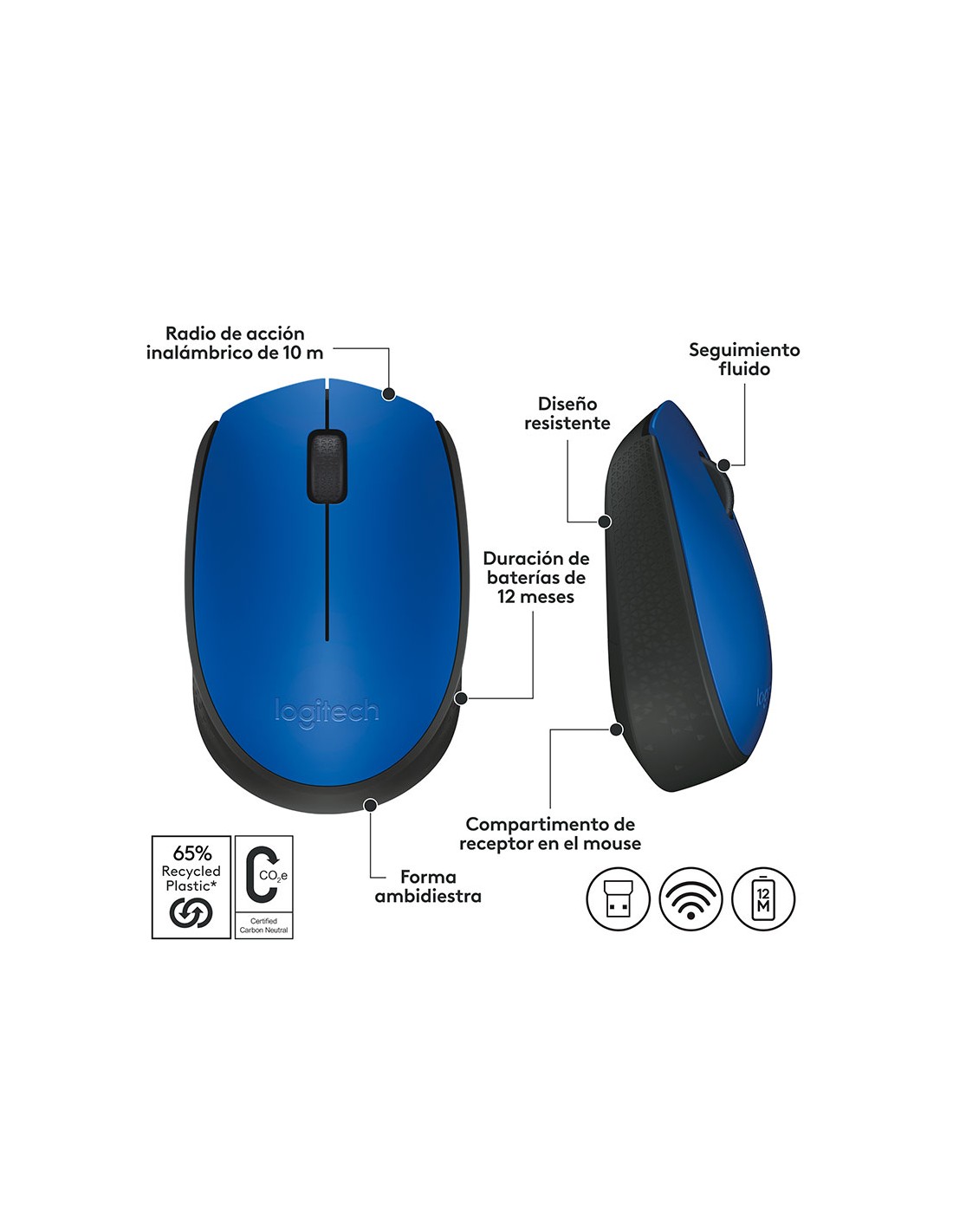 - Las piezas de plástico de M170 incluyen plástico reciclado posconsumo con certificación (mínimo 59% para modelos negro, azul/negro, rojo/negro, negro/gris, gris/negro, blanco crudo y 38% para rosado y gris azulado