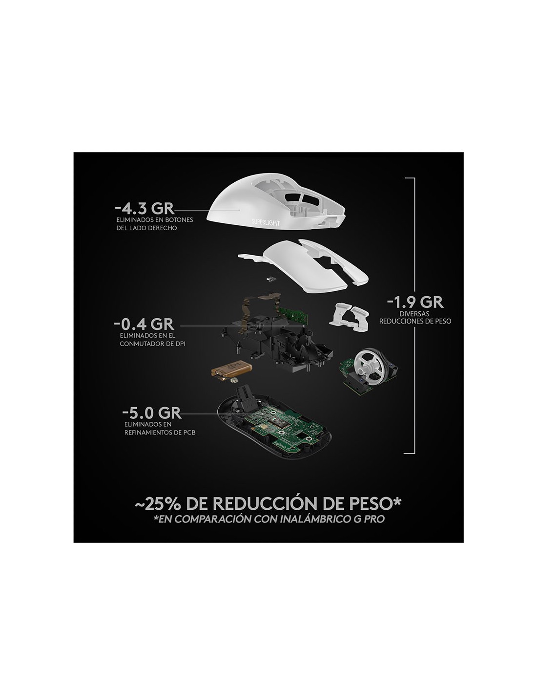 Nuestro mouse PRO más liviano hasta el momento, PRO X SUPERLIGHT es un avance de ingeniería que logra un peso de menos de 63 gramos, casi un 25% más liviano que nuestro mouse inalámbrico PRO estándar. Esto se logró a través de una ingeniería meticulosa para producir una reducción de peso extrema sin comprometer el rendimiento.
