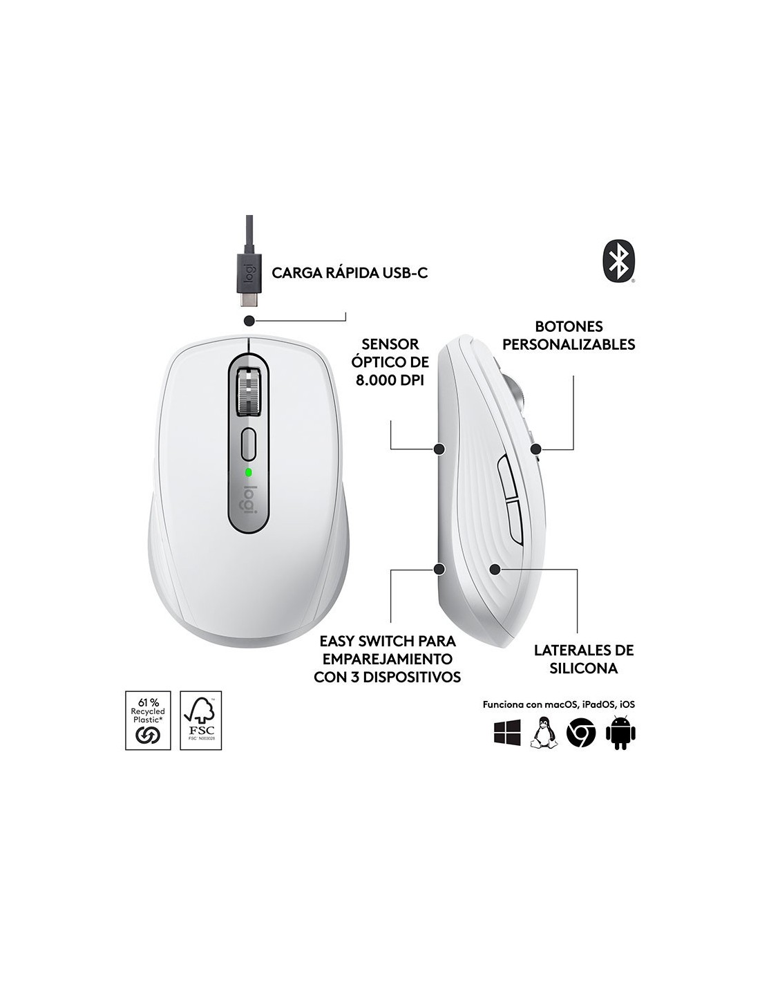 El mouse inalámbrico óptico Logitech MX Anywhere 3 presenta un tamaño compacto que lo convierte en el mejor aliado para el trabajo y la vida diaria. Este mouse se desplaza perfectamente y sin alfombrilla sobre cualquier superficie, incluso cristal. Su diseño ergonómico presenta, además, un aspecto discreto con agarres laterales de silicona y una forma que se adapta a tu mano. Tan sólido como confortable, es un ratón todoterreno que jamás te fallará. No importa qué dispositivo prefieras: portátil, computadora, MacBook, iPad o PC, puedes conectar hasta tres a la vez gracias a la tecnología inalámbrica con Bluetooth o el adaptador de USB del ratón. Con solo tocar un botón, podrás cambiar de dispositivo. Anywhere 3 es compatible con varios sistemas operativos a la vez, y funciona con Windows, macOS, iPadOS, ChromeOs y Linux. Por último, y gracias a su versatilidad con los flujos, te permite transferir fácilmente texto, imágenes y archivos entre dispositivos y ordenadores, con solo copiar y pegar.