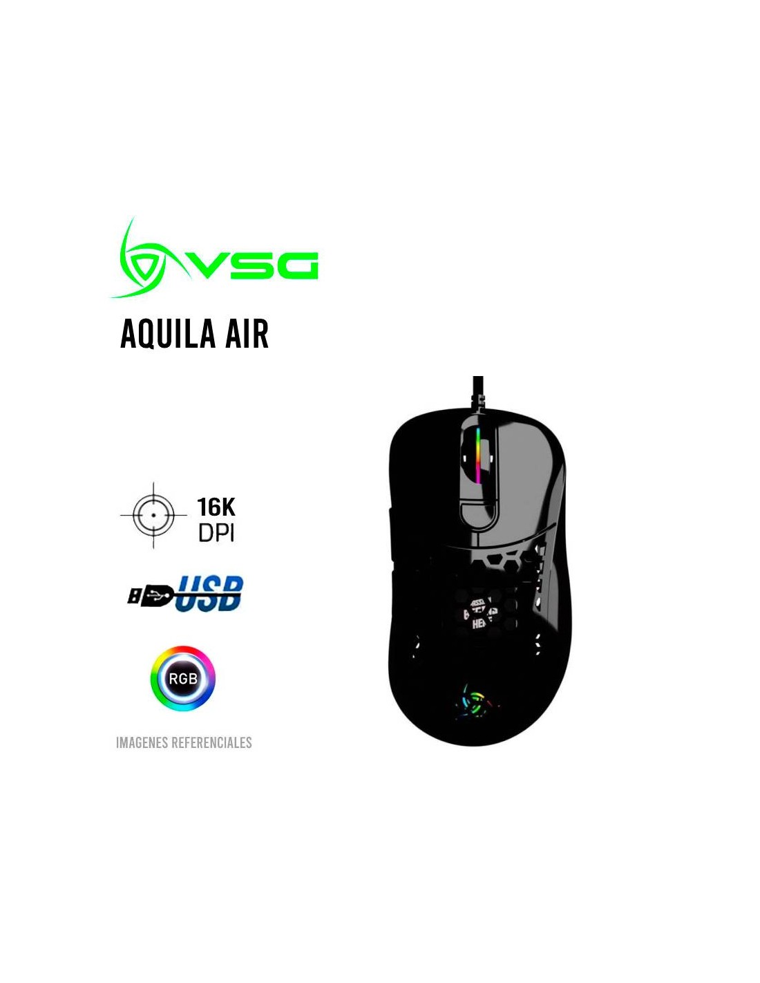 MOUSE VSG AQUILA AIR BLACK BRILLANTE ( VG-M550-BLK-GLO ) GAMING | 16K DPI | SENSOR PMW3389 | LED-RGB