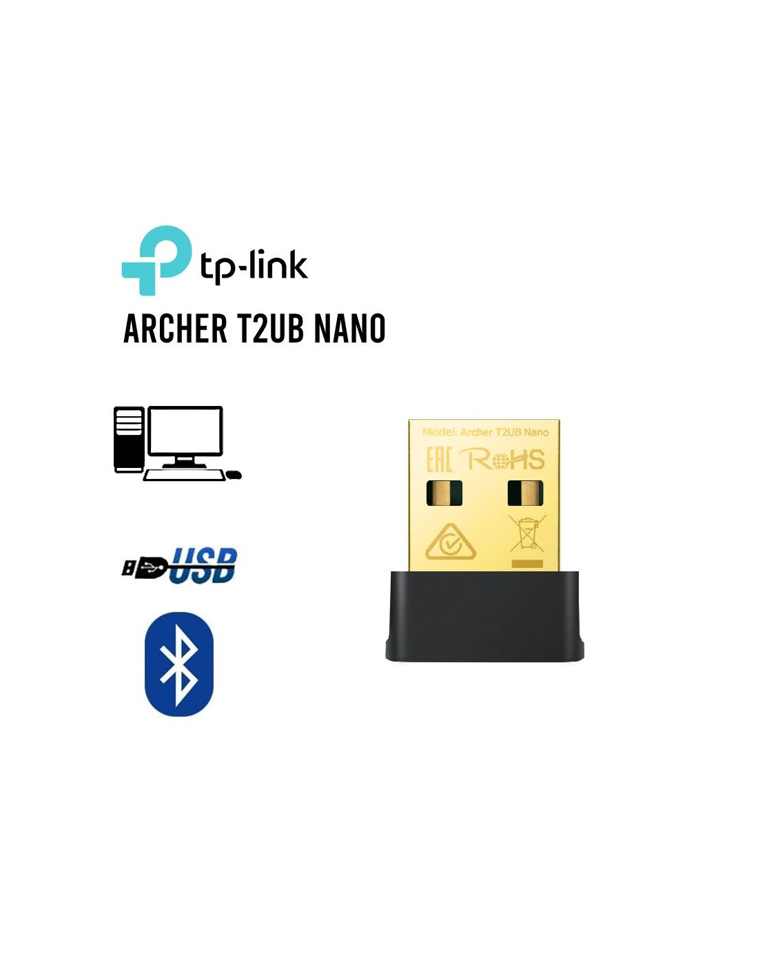 El TP-Link AC600 Nano Wi-Fi Bluetooth 4.2 USB Adapter (Archer T2UB Nano) es un adaptador inalámbrico compacto que combina conectividad Wi-Fi de doble banda (2.4 GHz y 5 GHz) con Bluetooth 4.2 en un solo dispositivo USB.