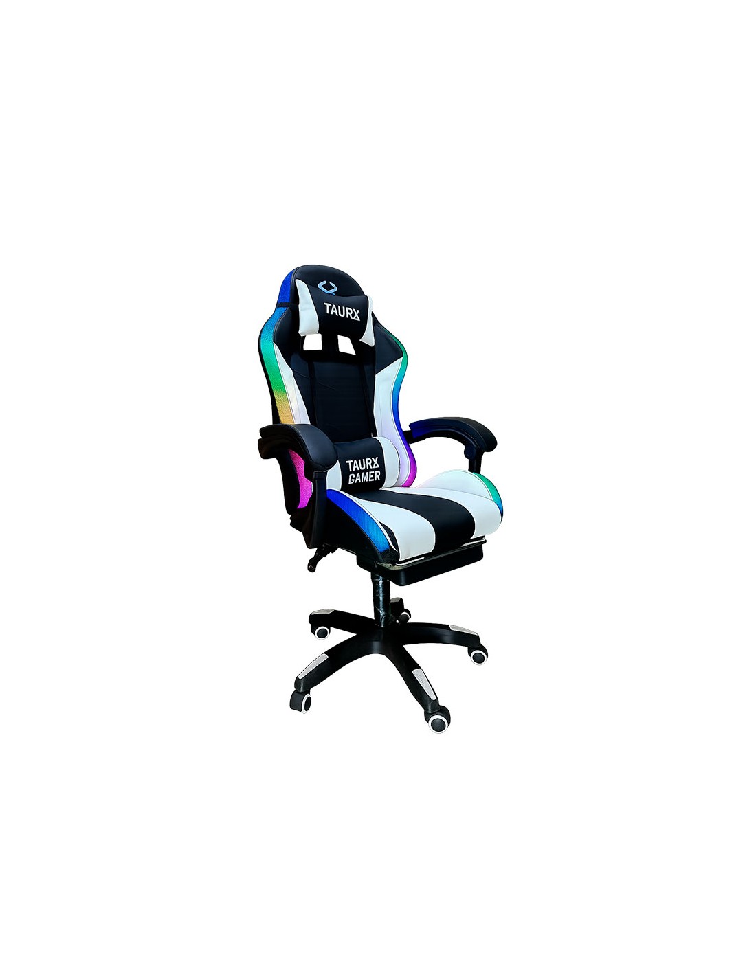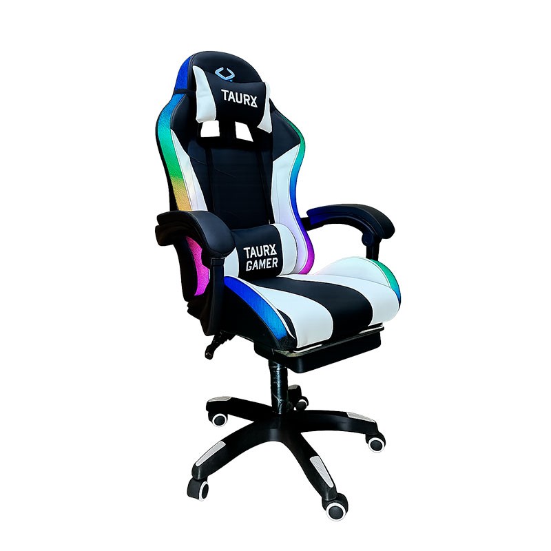La Silla Gamer TaurX RGB eleva tu experiencia de juego con un diseño ergonómico premium en cuero PU y un sistema de luces RGB con control remoto que transforma tu setup. Su respaldo reclinable 135°, altura regulable y cojines acolchados para cabeza y lumbar —este último con masajeador integrado— garantizan comodidad total en sesiones largas. Equipada con ruedas 360°, brazos y posa pies acolchados, ofrece movilidad y soporte superior. Capaz de resistir hasta 120 kg, combina durabilidad, estilo y confort. TaurX: calidad, garantía y la estética gamer que buscabas.
