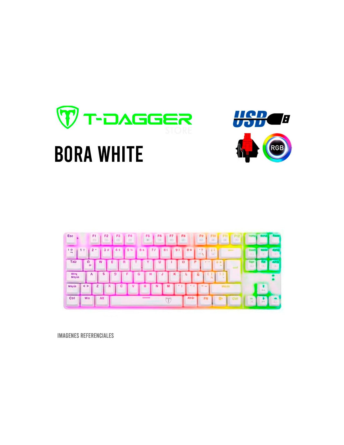 TECLADO T-DAGGER BORA WHITE ( T-TGK315W-RD ) GAMING | SWHITCH RED | LED-RGB