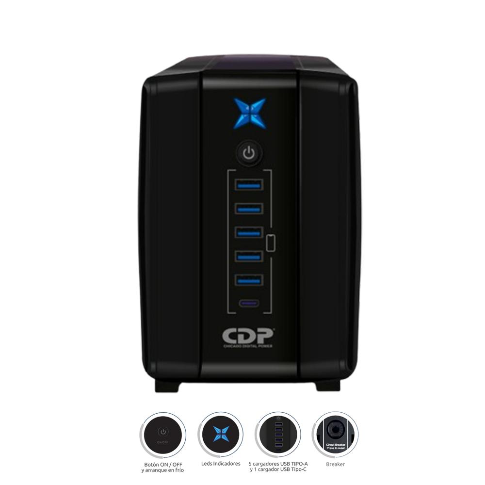 UPS CDP 500VA/250W (R-UPR508I) 8 TOMAS | 5 PUERTO USB-A - 1 USB-C | AUTOMONIA 20MIN| NEGRO