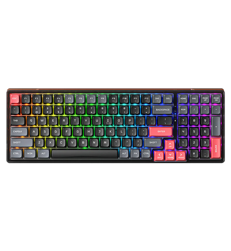 Adopta una disposición completa de 100 teclas, equipadas con un área numérica pequeña y teclas de edición de uso común. 16,8 millones de colores incorporados y 15 tipos de efectos de iluminación RGB, admite FN + tecla de desplazamiento hacia la derecha para recorrer los efectos de iluminación, FN + teclas de dirección para ajustar el brillo de la luz y la velocidad de la transmisión, y admite el ajuste personalizado del modo de iluminación en la página de configuración del controlado.